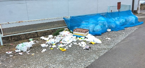 草木類が入ったごみ袋はネットの外に